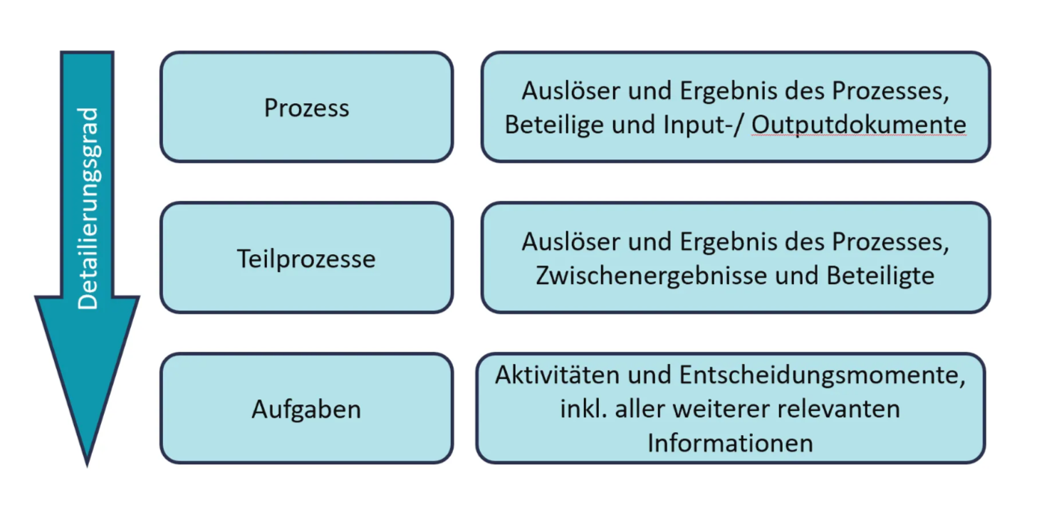 Text im Bild: Wissen & Werkzeug; Ebenen der Prozessbeschreibung; Detaillierungsgrad; Prozess; Auslöser und Ergebnis des Prozesses, Beteilige und Input-/ Outputdokumente; Teilprozesse; Auslöser und Ergebnis des Prozesses, Zwischenergebnisse und Beteiligte; Aufgaben; Aktivitäten und Entscheidungsmomente, inkl. aller weiterer relevanten Informationen.