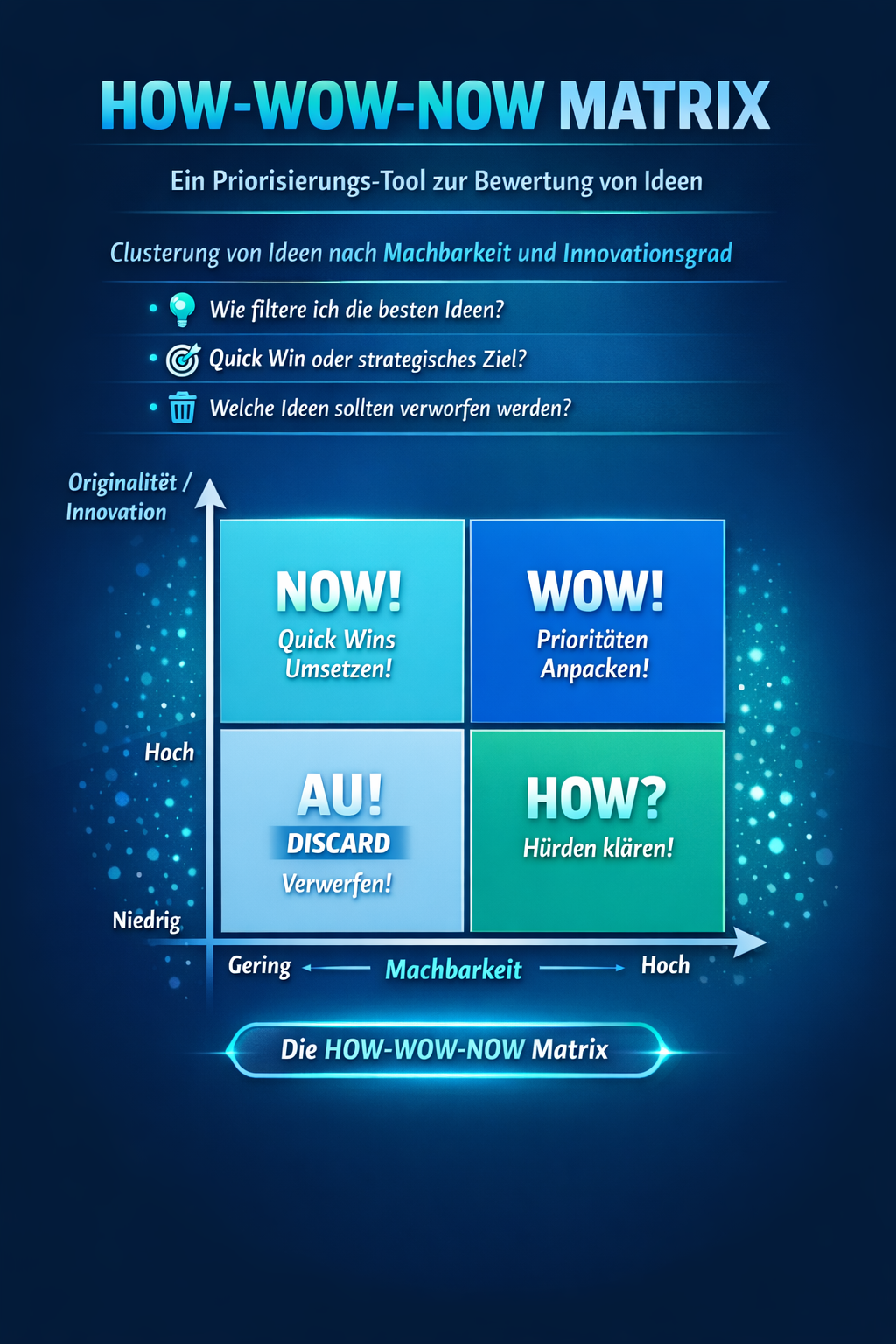 - Unten Rechts (Grün): Niedrige Innovation, aber hohe Machbarkeit. Titel: “HOW?”.