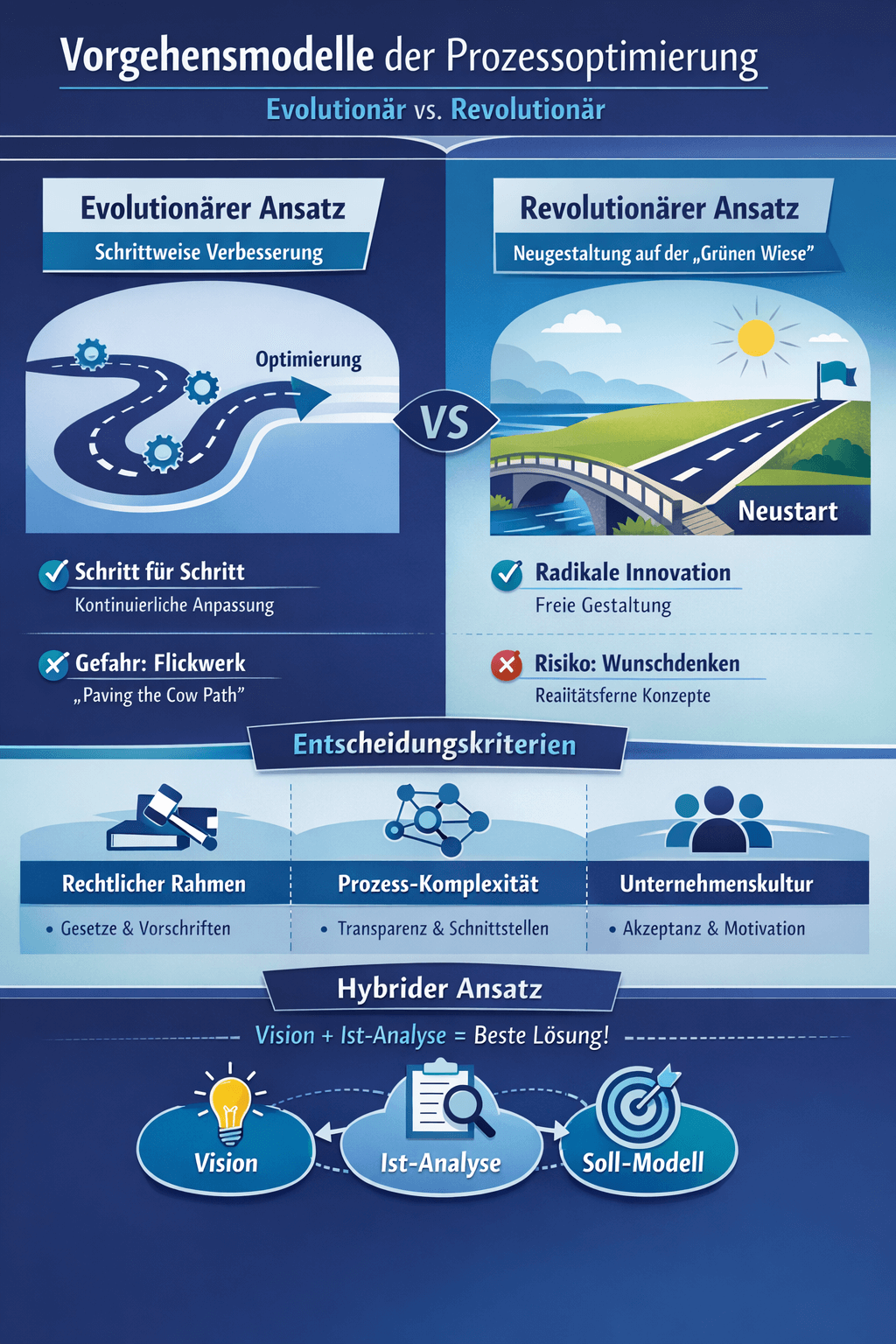🖼 GRAFIK: Vorgehensmodelle der Prozessoptimierung: Evolutionär vs. RevolutionärKI-Beschreibung: Eine vertikal strukturierte Infografik, die zwei gegensätzliche Ansätze der Prozessoptimierung (Evolutionär und Revolutionär) gegenüberstellt, deren Vor- und Nachteile analysiert, Entscheidungskriterien definiert und abschließend einen hybriden Lösungsansatz vorschlägt.
